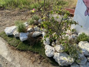 これは、農業用倉庫の壁面を活用し、ウォールアートと植栽を組み合わせた